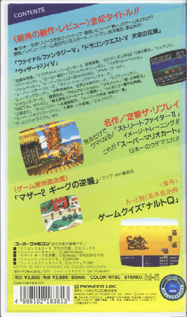 This Japanese video has previews, commercials, and other good "things" for many Super Famicom games released in the early 1990s, including Mother 2. It is hosted by a group of four people and a bat. Information about games is presented in several formats, including group discussions about the games and through a mock quiz game-show.